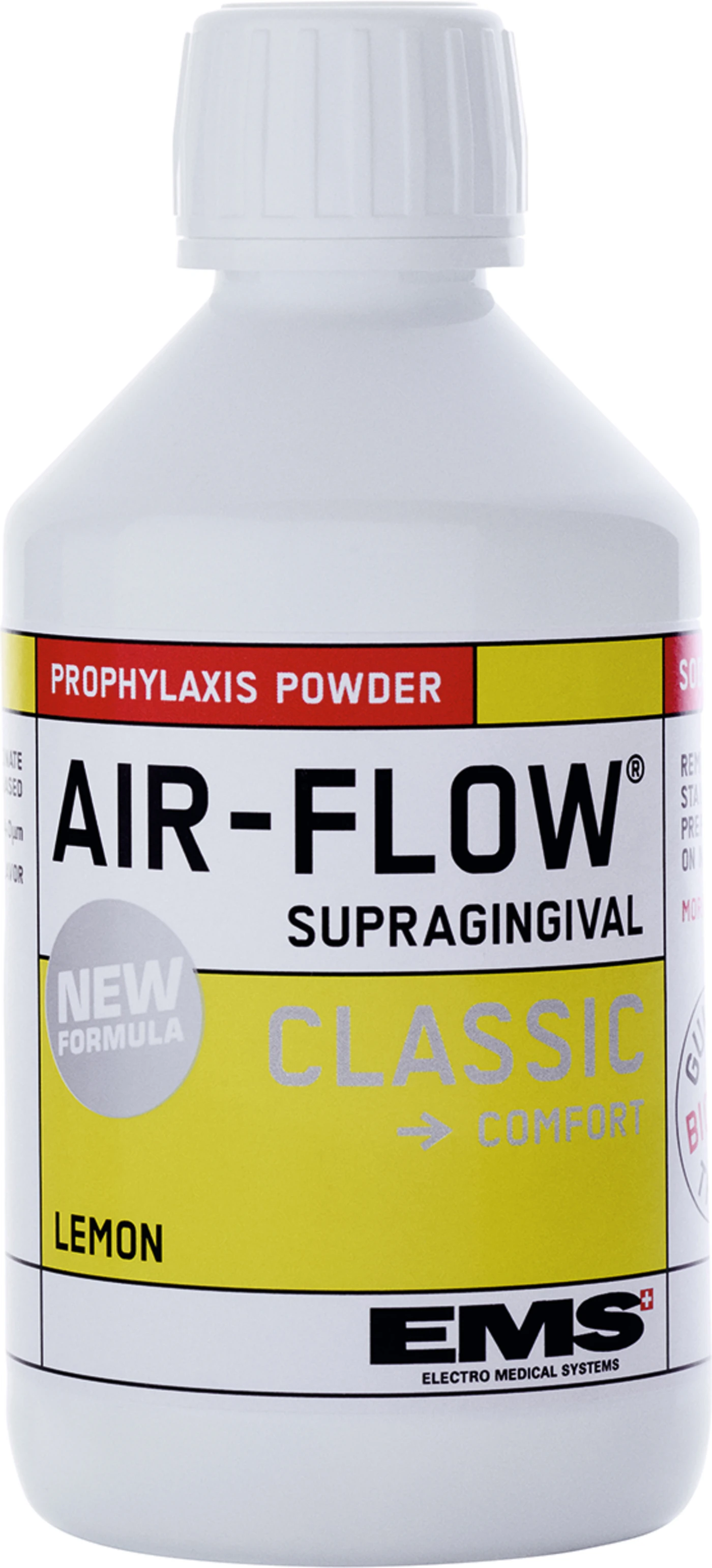 Die Evolution des Natriumbicarbonatpulvers AIRFLOW® CLASSIC Pulver: COMFORT. Die Korngröße wurde für einen höheren Patientenkomfort um nahezu 40 % von 65 µm auf 40 µm verringert. Das Pulver hat einen angenehmen Geschmack und hinterlässt ein angenehmes Mundgefühl und ist genauso effektiv in der Entfernung von Biofilm, starken Verfärbungen sowie jungem Zahnstein. Durch die verringerte Korngröße und die verschiedenen Aromen ist die Prophylaxe für Ihre Patienten deutlich angenehmer.